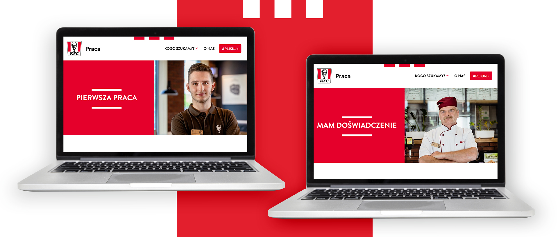 Naturalnie nie samymi materiałami BTL i social człowiek żyje, szczególnie w EB, dlatego na warsztat wzięliśmy stronę karierową KFC, która w całej kampanii jest głównym punktem styku potencjalnych kandydatów z marką. Poprzednia odsłona praca.kfc.pl wyglądała dosyć standardowo - proste informacje kierowane szeroko do wszystkich, co uniemożliwiało marce na odpowiedź na bardzo konkretne potrzeby naszego targetu. Potraktowaliśmy więc stronę karierową tak samo jak naszą kampanię, dzieląc stronę na dwie sekcje - “pierwsza praca” oraz “mam doświadczenie”. Taki zabieg pozwala nam na naturalną kontynuację ścieżki rekrutacyjnej, gdzie potencjalny kandydat dowie się więcej na temat pracy w KFC i znajdzie odpowiedzi na swoje pain pointy. Teraz znajdując naszą kampanię czy to online, czy na ulotkach w lokalach marki znajdziecie bezpośrednie odnośniki do podstrony, która interesuje najbardziej nasze grupy docelowe. Sprawdźcie sami następnym razem jak najdzie Was ochota na kurczaka od KFC ;).