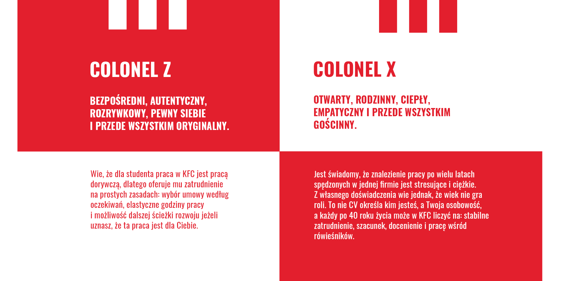 Pomysł kreatywny oparliśmy na cechach KFC, które wprowadzał już sam Colonel Sanders zakładając swoją pierwszą restaurację. Wspomniane cechy podzieliliśmy na dwie grupy tak, by zarówno pokolenie X, jak i Z mogło utożsamiać w nich swoje potrzeby i obawy.