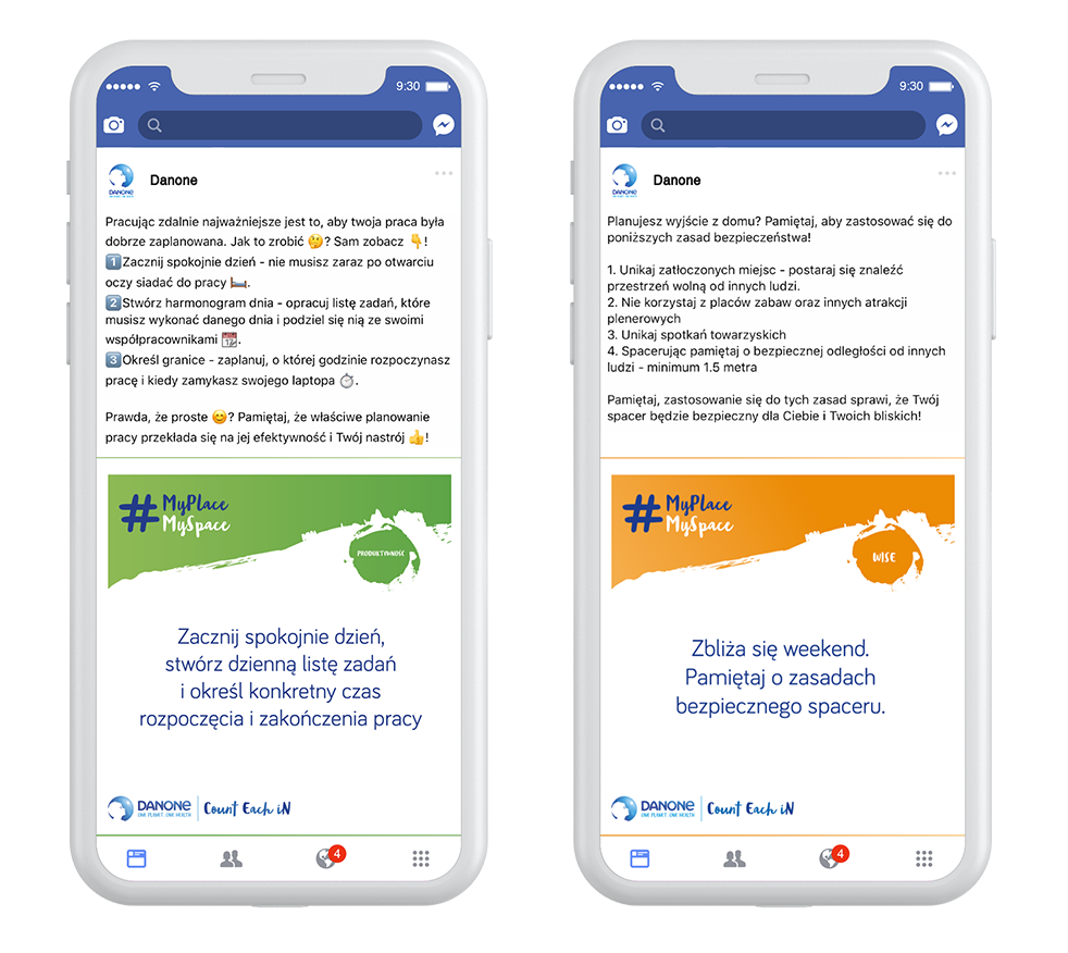 Pandemia zmienia nie tylko relacje marki z konsumentami, ale również pracodawcy z pracownikami. Tysiące ludzi z dnia na dzień, zamieniło swoje codzienne miejsca pracy, na własne mieszkania. Nie wszyscy wiedzą, jak odnaleźć się w tej sytuacji, dlatego razem z zespołom komunikacji wewnętrznej grupy spółek DANONE, zaczęliśmy działać. Mieliśmy jeden dzień na przygotowanie kampanii informacyjno-edukacyjnej na Workplace (Facebook dla firm), skierowanej do pracowników grupy spółek na rynku CEN, czyli z Europy Centralnej i krajów nordyckich, o tym jak radzić sobie z działaniem w trybie home office. Wspólnie stworzyliśmy kampanię pod hasłem #MyPlaceMySpace dzięki której z humorem, którego wszyscy teraz potrzebujemy, przekazujemy stworzone przez Klienta porady o tym jak pracować z domu, żeby efektywnie realizować swoje zadania. W pierwszej kolejności szczególnie ważne, było poinformowanie w jaki sposób właściwie przeprowadzić wideokonferencję, tak aby nie obciążać systemów. Udało się nam. Dzięki dobrej współpracy na linii Klient – Account, i sprawnemu działaniu zespołu kreatywnego opracowaliśmy kampanię i materiały graficzne. Ze względu na specyfikę sytuacji, nie wiemy, ile potrwa kampania, ale wiemy, że pierwsza publikacja już w tym tygodniu.