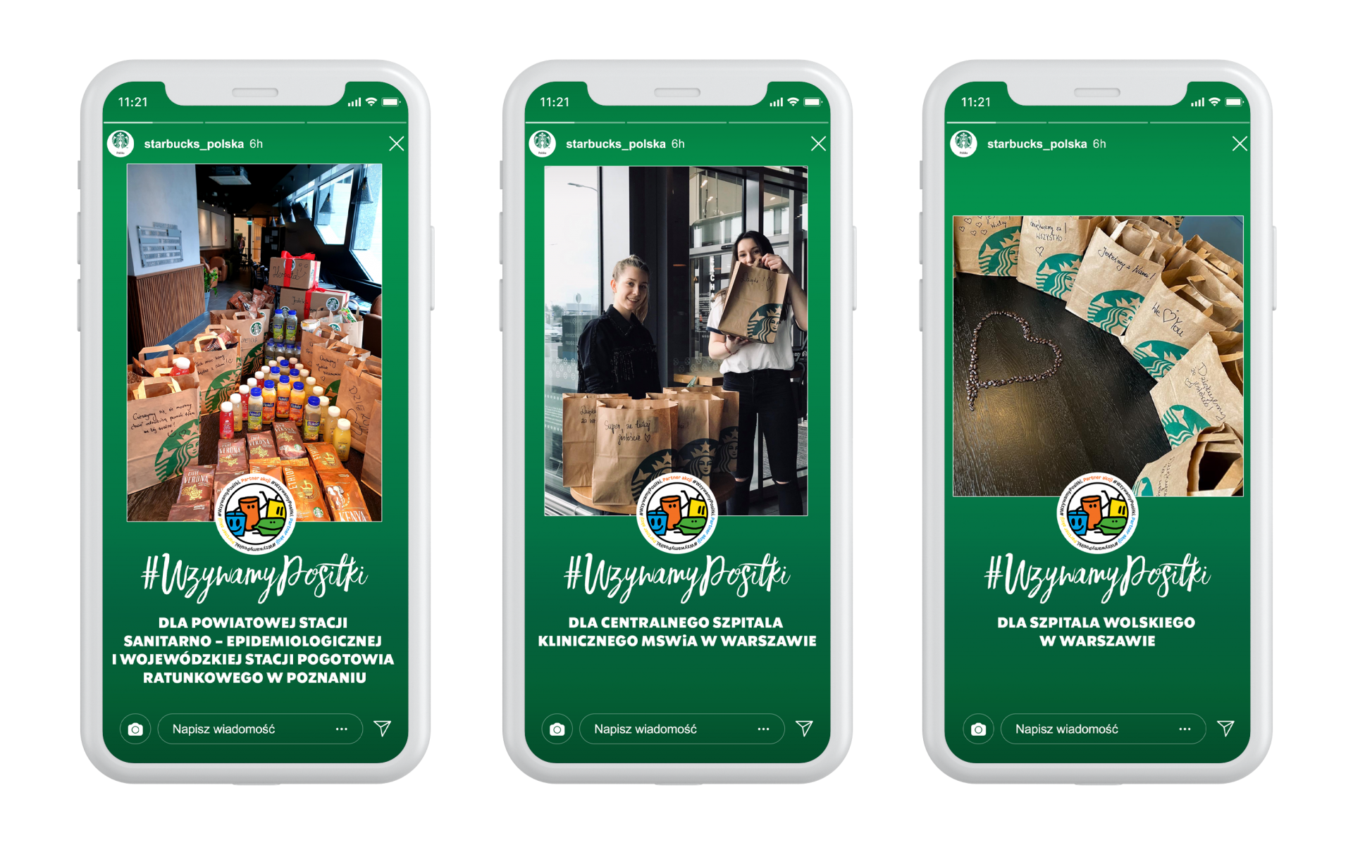 Jest jedna grupa zawodowa, która bardziej niż ktokolwiek będzie teraz potrzebować kawy. To pracownicy ochrony zdrowia, którzy są na pierwszej linii walki z pandemią. Dlatego Starcbuks Polska dołącza jako strategiczny partner do akcji #WzywamyPosiłki, a kawa i produkty Starbucks trafiają do szpitali w całej Polsce. Do pomocy zaangażowali się bariści, którzy pomagają w dostarczaniu paczek do szpitali. Przebieg akcji relacjonujemy w social mediach, publikując relacje na Instagramie.