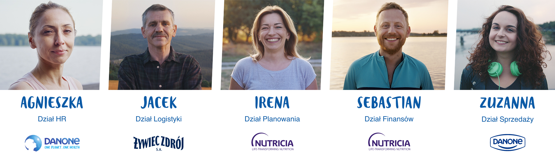 Kampanię rozpoczęliśmy od spotu wizerunkowego, w którym wystąpiło pięciu pracowników DANONE z pięciu różnych spółek. Wybór bohaterów, którzy w jednej historii pokażą, jaki jest DANONE było długotrwałym i złożonym procesem. Po wielu spotkaniach, rozmowach i sprawdzaniu różnych konfiguracji wyłoniliśmy pięć zupełnie różnych osobowości, które łączy DANONE. Naszym celem było przedstawienie prawdziwych ludzi i wartości jakie im towarzyszą w DANONE, dlatego przyjęliśmy charakter dokumentu.