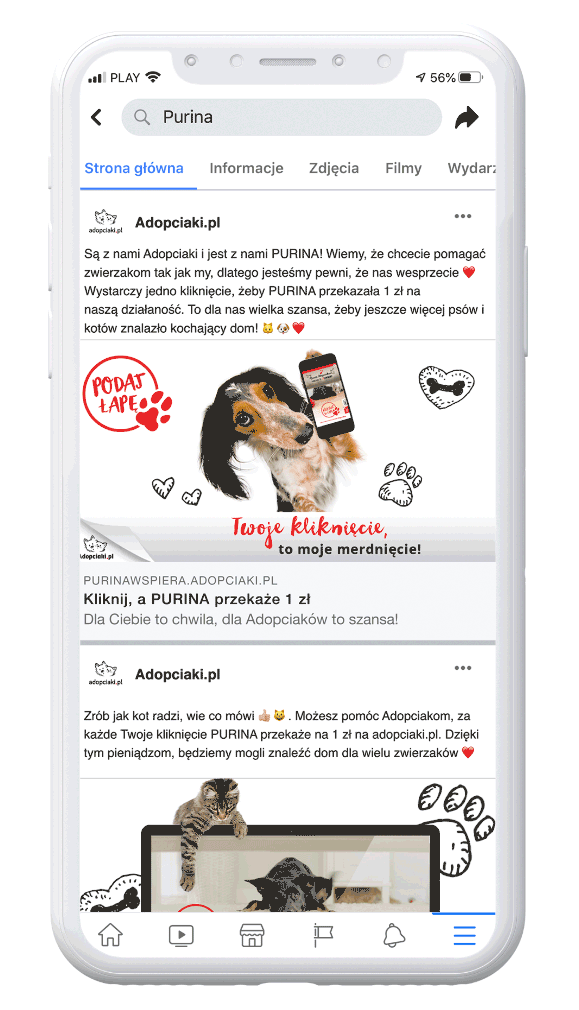 W 2016 roku PURINA chciała zrobić coś więcej - zwiększyć świadomość fundacji adopciaki.pl wśród miłośników zwierząt i zachęcić ich do wspólnej pomocy. Naszym zadaniem było stworzenie aktywacji, w której za każde kliknięcie na landing page’u, PURINA przekazywała 1 zł na wsparcie programu adopciaki.pl.