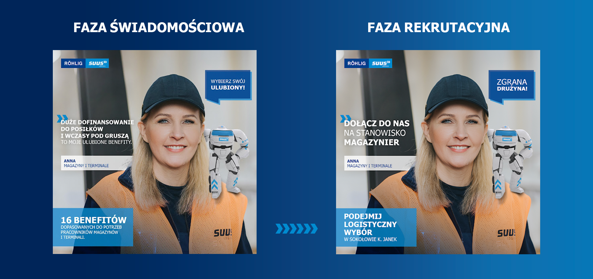 Zbudowanie świadomości marki pracodawcy ROHLIG SUUS Logistics, jako polskiej firmy, lidera rynku TSL w Polsce oferującego wyjątkowo szerokie możliwości rozwoju kariery. Skuteczny Employer Branding powinien przekładać się na cele biznesowe. W przypadku SUUS, jest nim przyciąganie najlepszych kandydatów, co pozwoli spółce na utrzymanie pozycji lidera i realizację strategii #OneStepAhead.